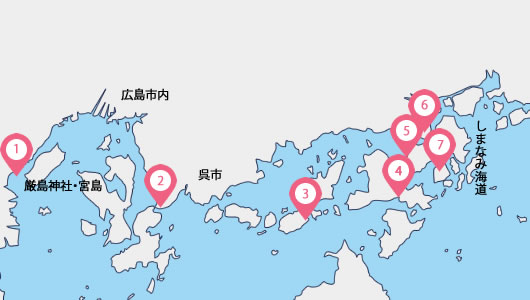 | 主要スポット | 戦艦大和建造ドック跡・海上自衛隊呉基地・音戸の瀬戸・瀬戸田すいぐん丸・伯方島・開山公園千本桜・大三島・せとうち茶屋 |